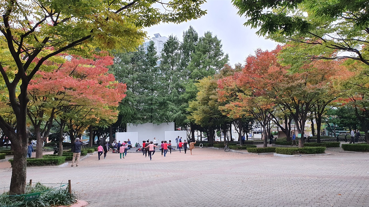 ▲ 시청 앞 녹음광장의 야외공연장. 사회적 거리 두기가 2단계로 낮아지며 건강체조를 하는 분들이 공원에 나오셨다.
