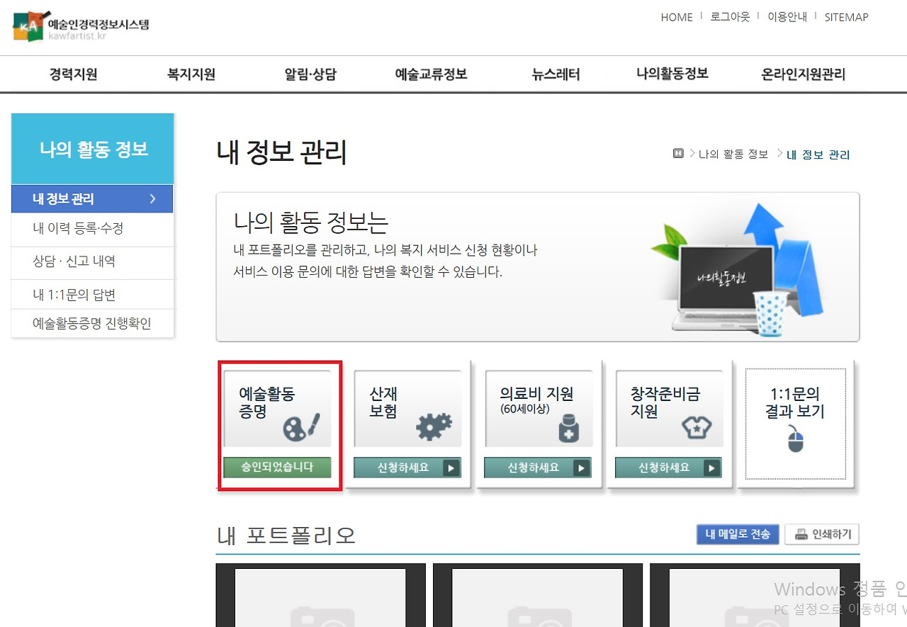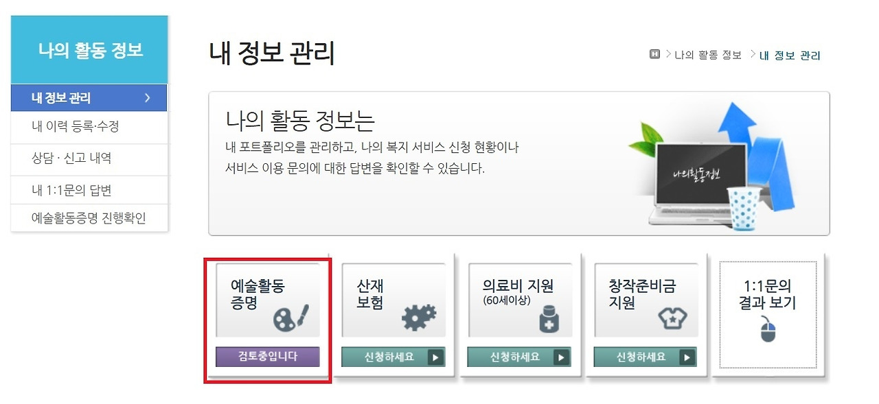 1. 재단 사이트에 접속해서 회원가입을 하고 로그인 후 '예술활동증명' 탭을 누른다.