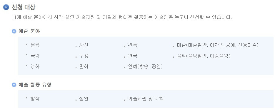 인정 분야는 문학/미술(일반, 디자인공예, 전통미술)/사진/건축/무용/음악(일반, 대중음악)/국악/연극/영화/연예(방송,공연)/만화 등으로 다양하다. 공개 발표된 예술활동 자료(책, 포스터, 영상자료 등) 또는 예술활동 수입 증빙자료가 있으면 증명을 신청할 수 있으니 해당 분야에 계신 분들 중 아직 이 제도의 존재를 모르시는 분이 계시다면 사이트에 방문해 보시면 좋을 것 같다.