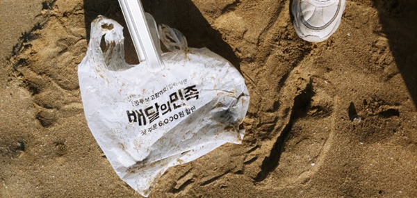 ▲ 해변쓰레기 줍기 (비치코밍) 중 만난 비닐봉지: 쓰레기 사진을 모아보면 각종 브랜드 열전. 배달앱은 죄가 없지만 우리가 투기의 민족이 된 것은 아닐까 싶을 때도 있다.