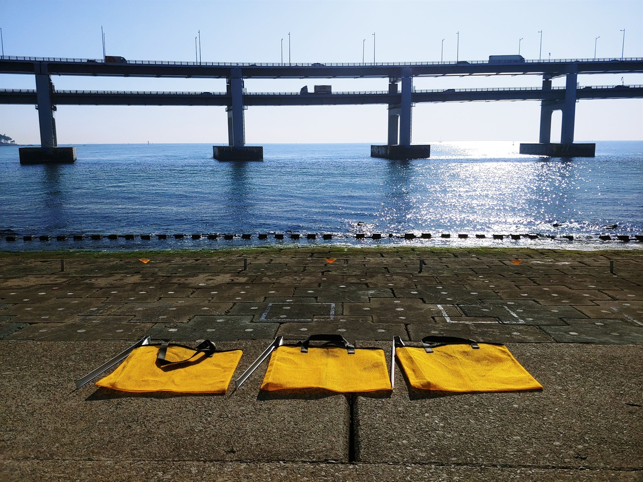 ▲ 민락수변공원에서 플로깅: 자투리그물을 업사이클링한 가방과 쓰레기집게의 힙한 만남. 요즘 놀러 갈 때 쓰레기가방 하나 정도는 끼고 가잖아요?