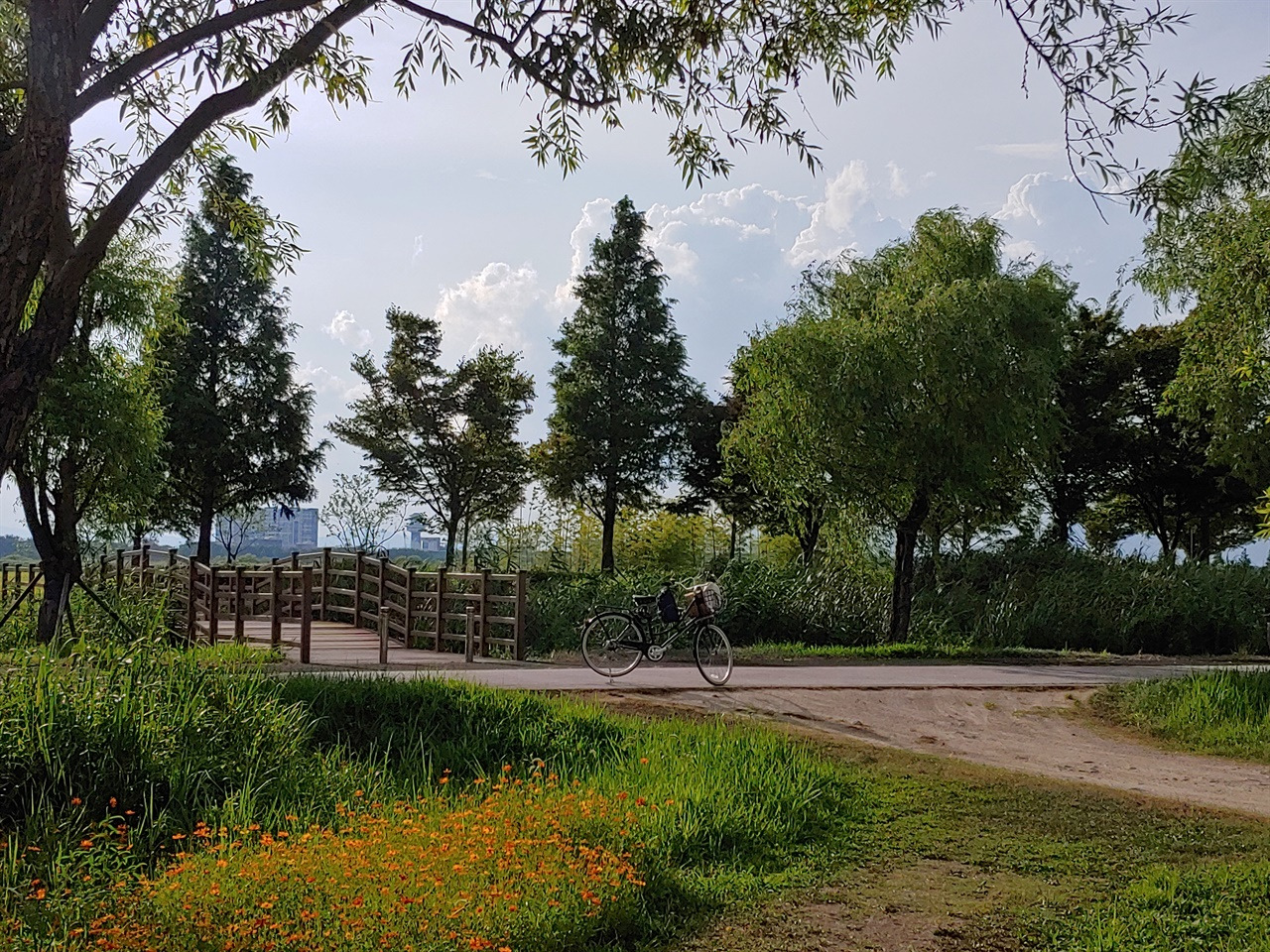 그런데, 저녁과 다음날 아침에 자전거를 타려면 대여소 자전거가 아닌 내 자전거를 써야 하고, 평일에는 지하철에 자전거를 실을 수 없게 돼 있었다. 짐을 들고 걷는 일에도 몹시 취약한 터라, '그래, 진정한 도시 탈출이란! 내 손 내 발을 부지런히 놀려 도시를 탈출하는 것이지!'라고 생각해 버렸다. 자전거로 이동하고, 넓은 공원에서 놀고, 개인실에 가서 책을 보며 쉰다. 이 정도면 코로나 맞춤형 여행 아닌가.