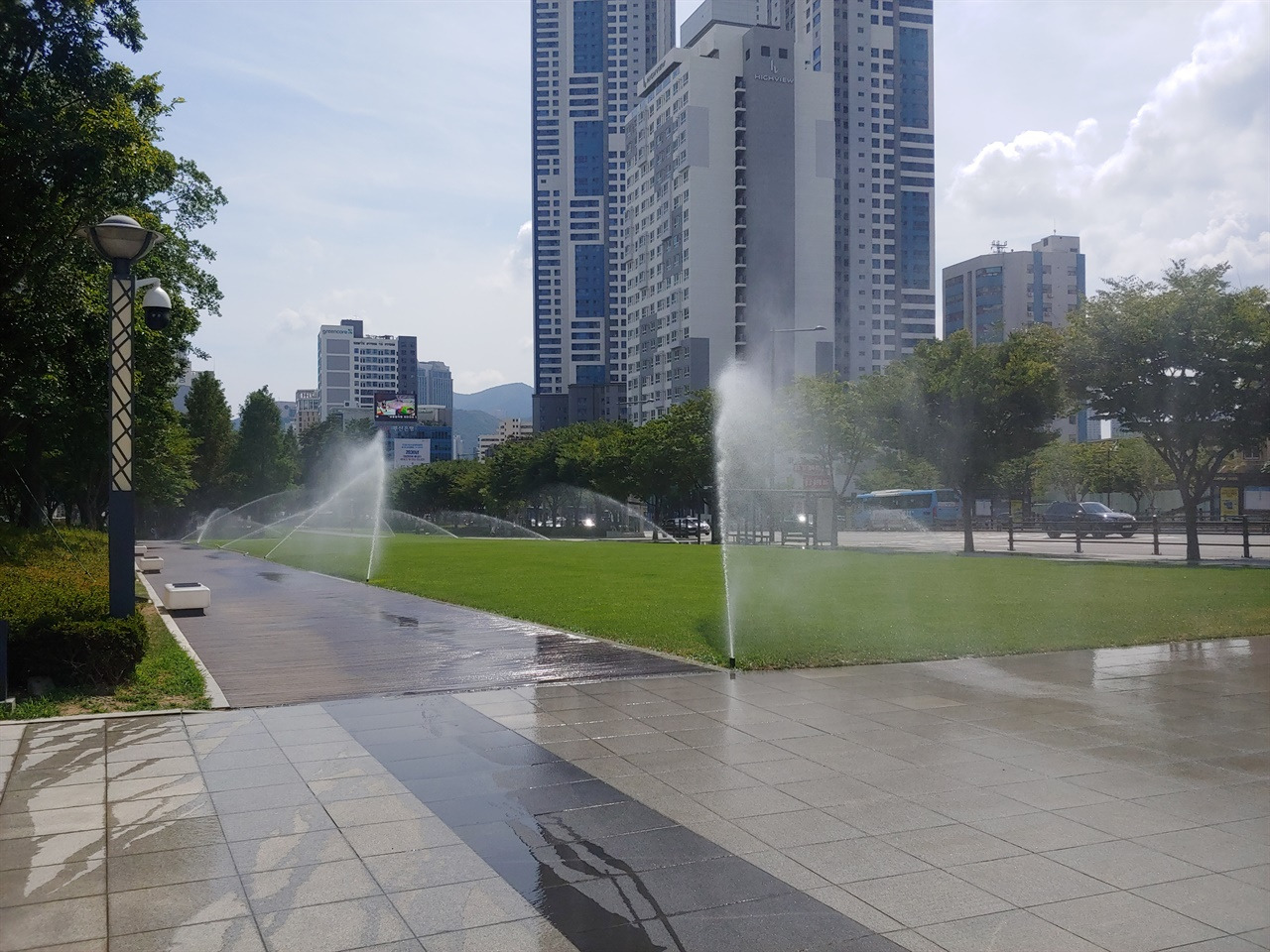 ▲ 부산 서면 근처의 송상현광장 연제구에서 부산진구로 이어지는 길에 있는 송상현광장. 오븐에 바싹 구워진 나는 급수받는 잔디가 되기로 했다. 젖는다며 만류하는 관리요원분들께 "괜찮아요!!"라 외치며 느긋하게 자전거를 끌었다. 물줄기가 몸을 훑는 순간, 하, 이게 또 맛이로구나.