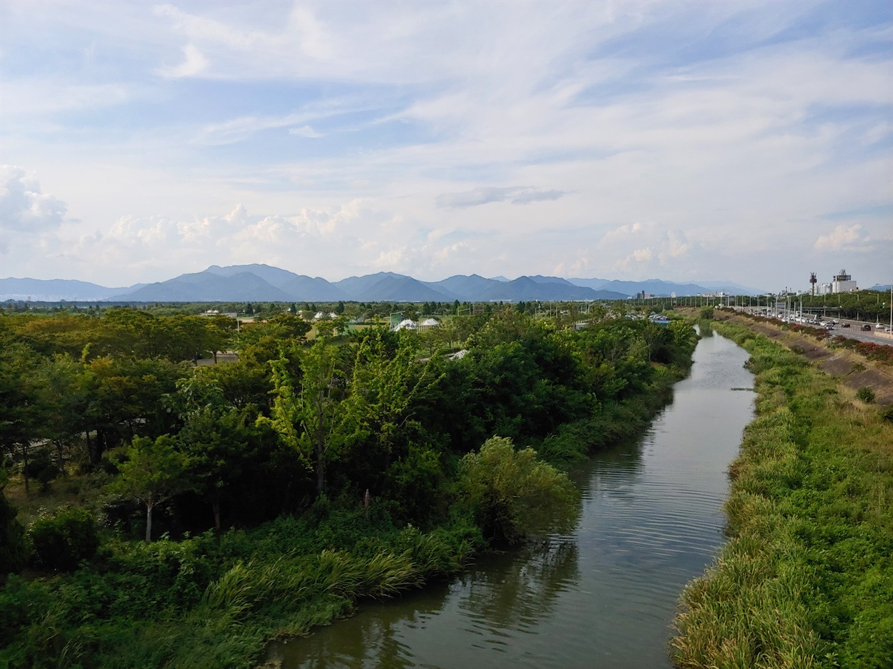 출발 시각으로부터 정확히 4시간이 지나 삼락생태공원에 다다른 순간, 멀리 흰 구름떼와 산떼(?)가 나를 위해 몰려오고 있었다. 사방의 대문을 열어제끼듯 시야가 탁 트였다는 느낌을 받는 것이 얼마만인지! 피로가 감동을 먹고 녹아버리는 듯했다. 쭉쭉 뻗은 붉은 바닥에 흰색으로 그려진 자전거 그림을 나는 '내 세상'이라 읽었다.