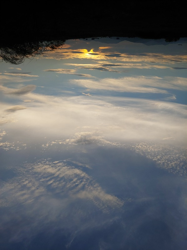 ▲ 처음으로 뒤집어서 본 해질녘 하늘 자전거를 세워두고 스트레칭 동작을 하다가 새로운 사실을 발견했다. 머리를 물구나무 서기에 가깝게 땅에 붙이고 보면, 이런 하늘이 지구 근처에서 보는 대기권처럼 보인다는 것. 어찌 사진으로 다 담을까.