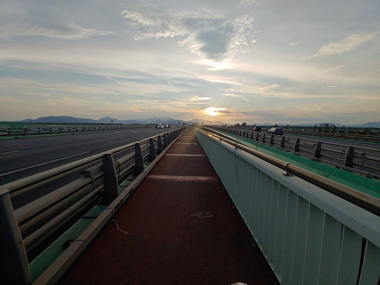 ▲ 뒤로 돌았더니 장관이 있었다 끊긴 도로 덕분에 노을을 파노라마로 보며 달리는 흔치 않은 기회를 얻었다.