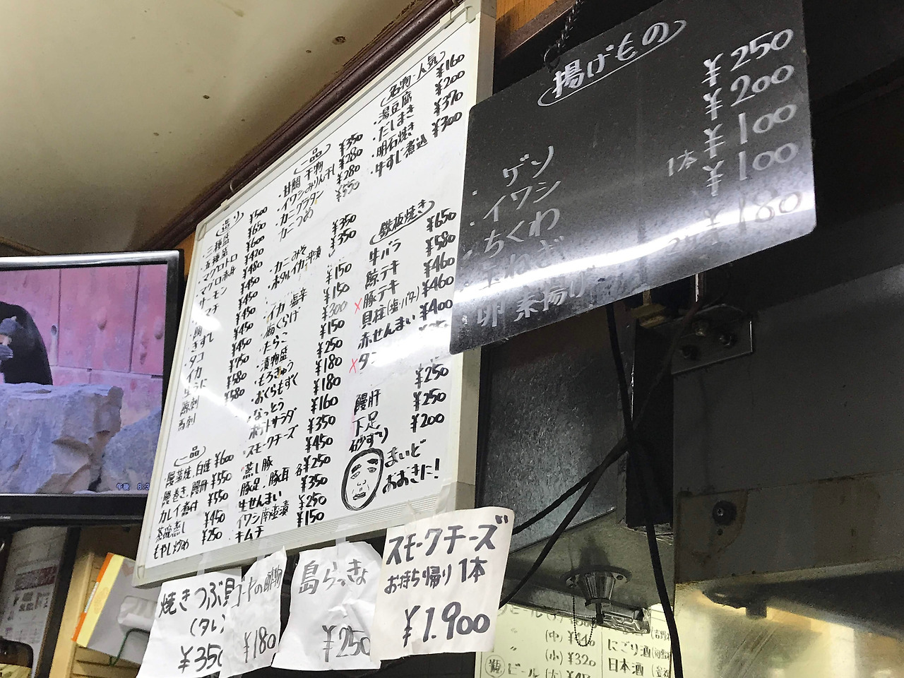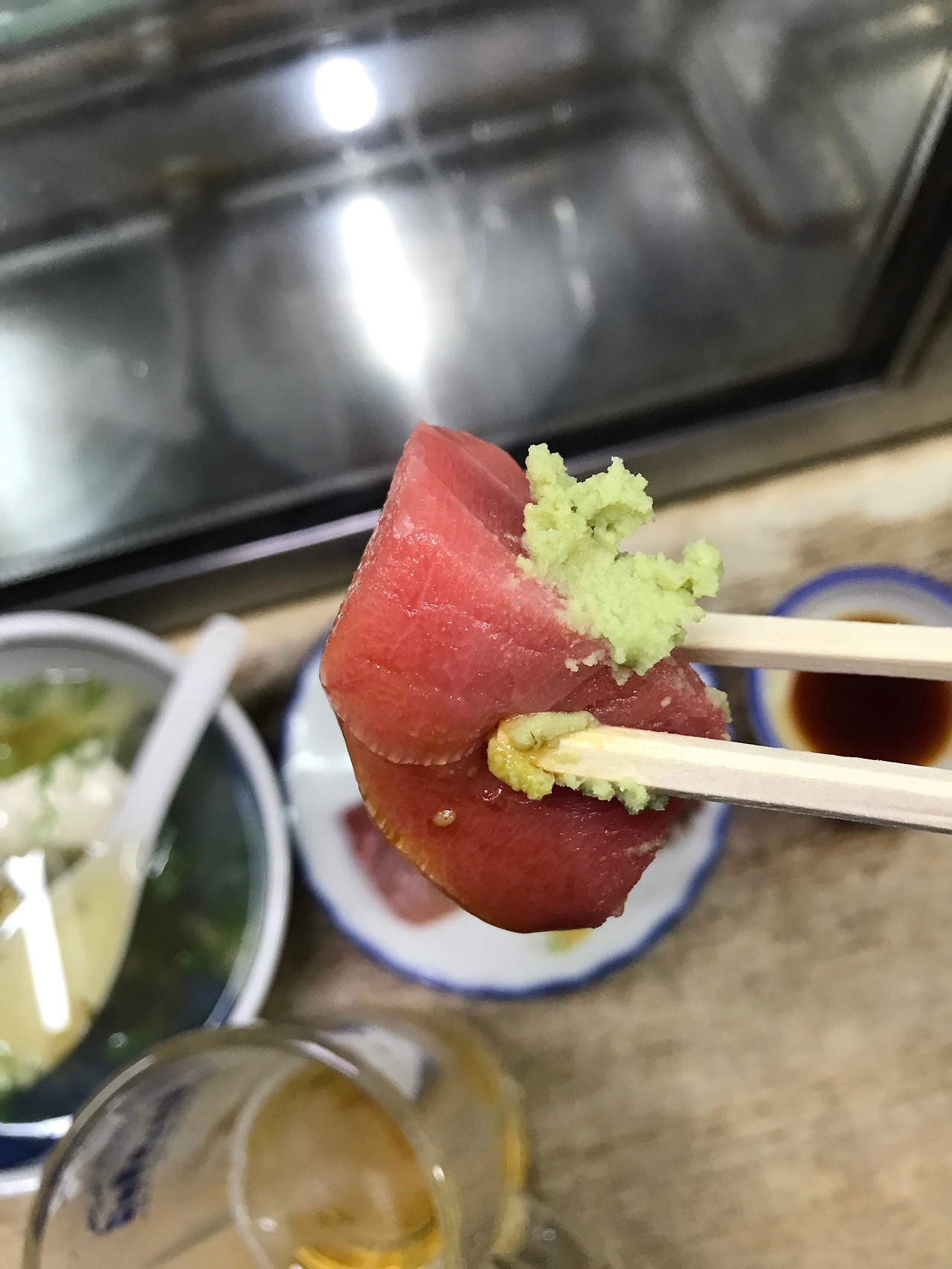 생선3종류 모듬이 500엔이고, 생맥주 중간사이즈가 440엔이니까 1000엔 이하로 맛나게 한잔 할 수 있는곳으로 부담없는 가격이 계속 술을 부른다. 오늘밤은 최소한 3차 이상을 가려기에 음주속도 조절을 위해 츄하이 레몬으로 상큼하게 마무리 한다. 생선회가 어찌나 신선한지 간장 살짝 찍고 와사비를 조금 올려 먹는데 입안에서 스르륵 녹아버린다. 알싸하게 퍼지는 와사비의 향이 코끝을 아리는데 이곳에서 1차로만 끝내야되는게 아쉽다.