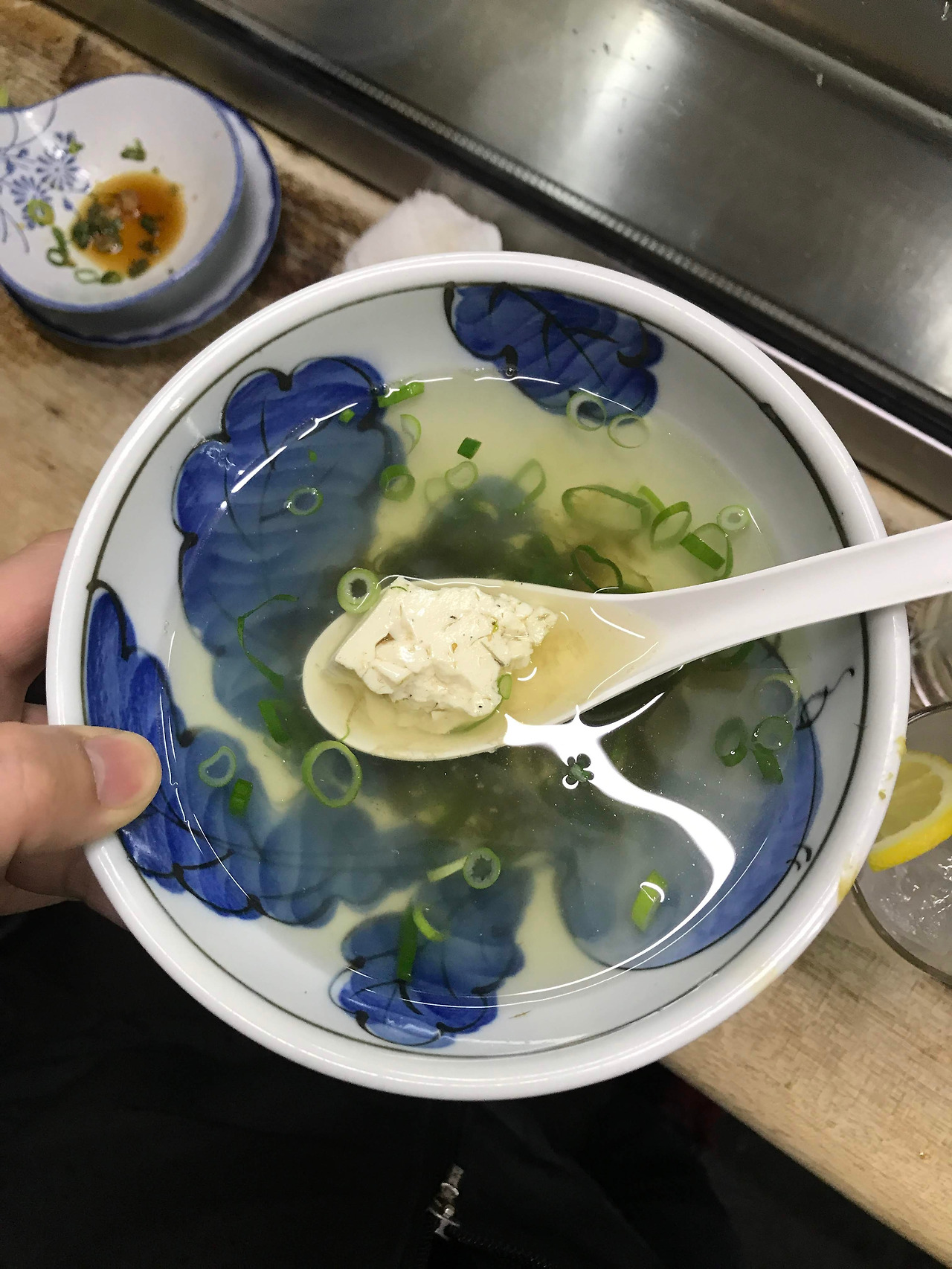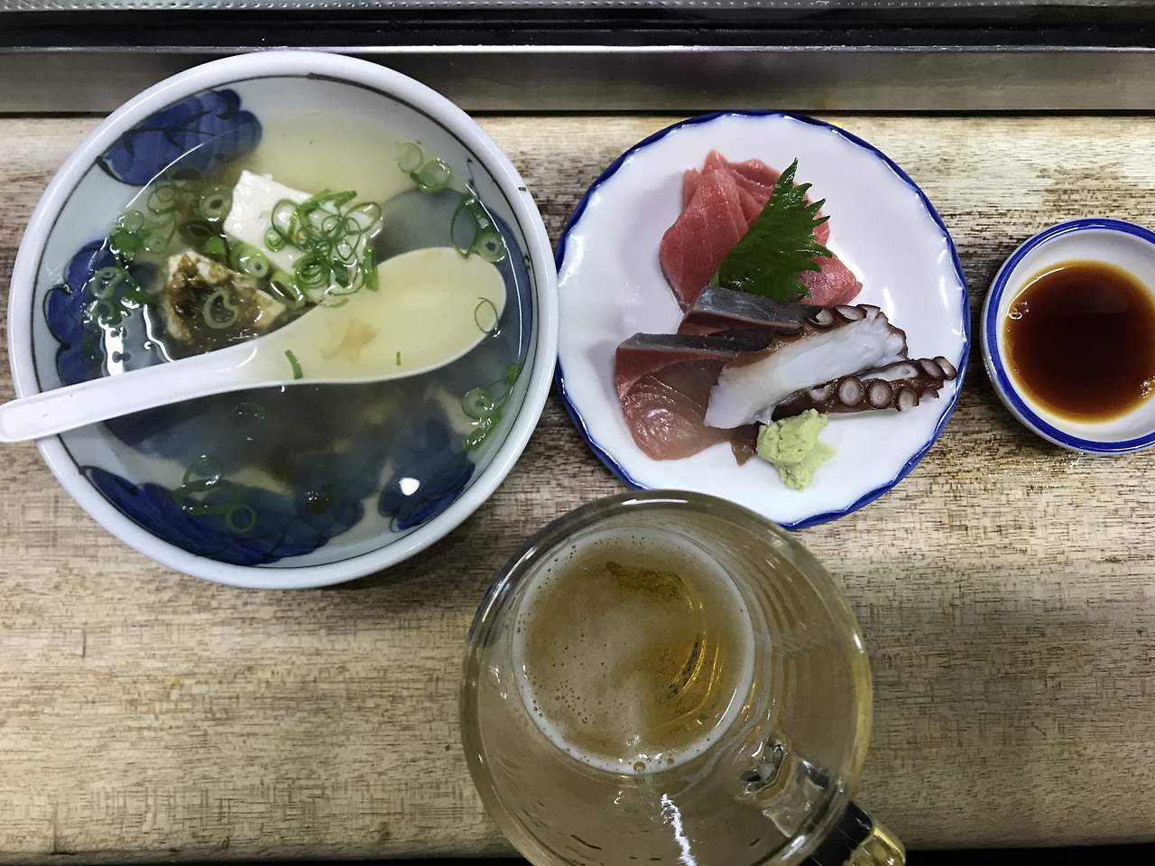 파레김과 작게 썰어넣은 두부가 들어간 맑은탕은 후추의 알싸한 풍미가 함께 곁들여져 국물을 후르륵 마시면 그 시원함에 속이 깨운해져 호기롭게 오카와리(한잔 더)를 외치게 된다. 오호, 대접받는 기분이 드는 다치노미야(선술집)다. 시원하게 맥주 한잔을 들이키며 주변을 관찰하니, 주로 40대이상이고 6,70대도 많은 곳이기에 혼자마셔도 전혀 쓸쓸함이 느껴지지 않는건 내가 외국여행자이기 때문일까 ? 아니면 언제라도 옆사람과 편하게 이야기 나누는 오사카 사람들의 오지랖 때문일까?