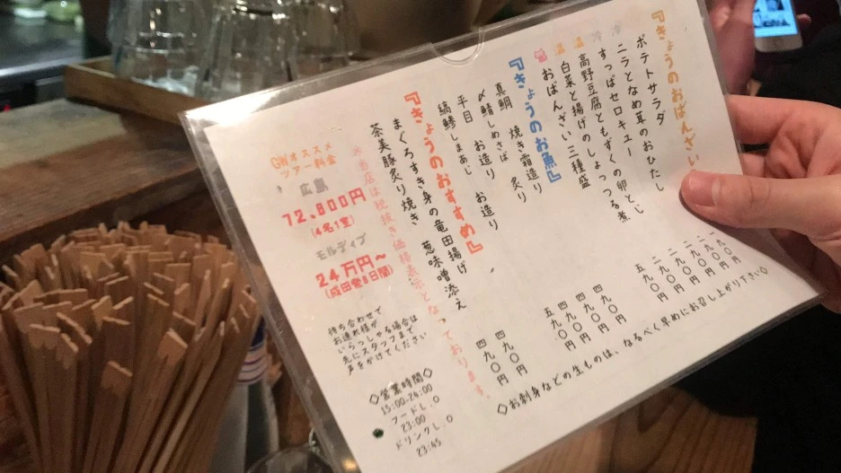 다치노미 자쿠도 마치루다? 맞나? 잭과 마틸다. 란 뜻인가? 밖에서 안이 잘 보여서 꽤 조용하고 일본틱한 분위기다. 들어가 보면? 굉장하다. 정말 캐주얼하고 젊은 분위기다. 오사카 교바시 쪽의 다치노미야의 아재들 분위기와 전혀 다르다. 자리가 꽉 찼다. 완전 100% 현지인. 물론 메뉴는 일본어. 일본어가 안되면 좀 불편할 수 있다. 관광객들이 없는 이유가 있겠지만 오사카 상인들은 워낙 친절하니까 한번 부딪쳐보는 것도 좋을듯하다. 일하는 스태프는 전부 20대로 보인다. 젊다. 젊어.
