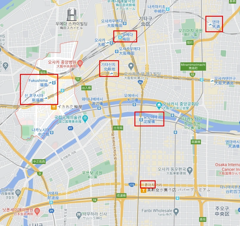 후쿠시마? 일본 원전 사고가 났던 동북쪽에 있는 지역과 같은 이름이다. 오사카에 후쿠시마가 있다고? 현지인 술집에서 한잔하고 싶다면? 일본인들 인스타그램 태그를 검색하면 핫한 곳을 찾을 수 있다. 오사카 우메다 역 부근은 자주 갔었지만 왼쪽의 후쿠시마는 처음 가본 듯하다. 나카노시마로 연결돼있으니까 이전에 와봤을 수도 있겠다. 특별한 기억이 없는 걸로 봐서 스쳐 지난듯싶다.