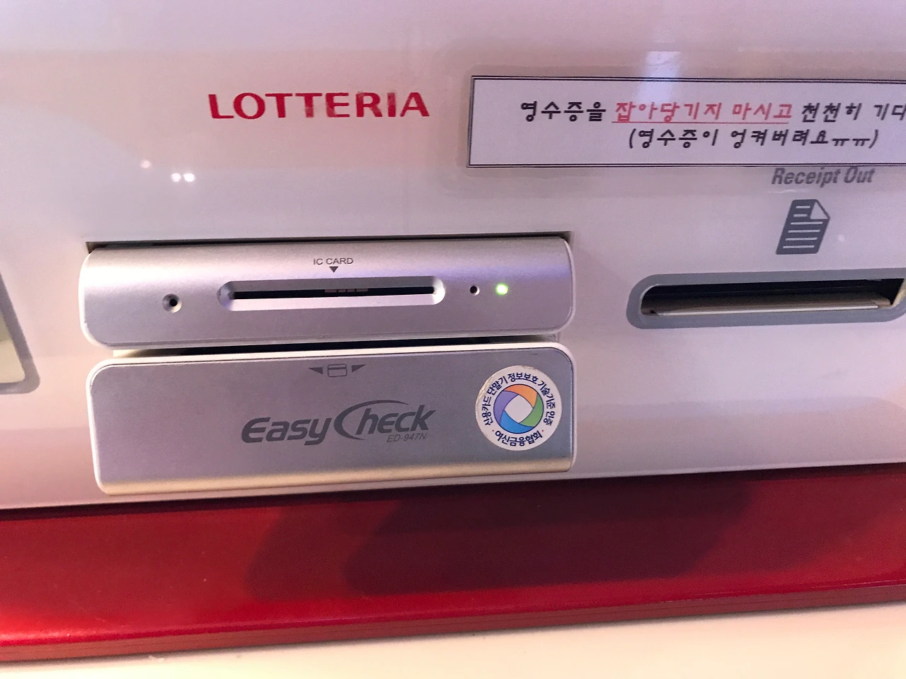 어. 이상하네. 아까 그렇게 했는데. 칩이 있는쪽이 아니었나 ? 칩을 앞쪽으로 해서 밀어 넣었다. 앞쪽에서 막히는 이 느낌. 순간 더 당황. 어떻게 하지 ? 주문대 앞에서 5분정도는 있었던거 같다. 신용카드를 좀더 세게 밀어 넣었더니 스윽 하면서 앞쪽으로 밀고 들어간다. 모니터의 결제버튼을 클릭하니 결제가 되었다.