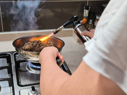메리야스에 팬티바람으로 토치질을 하며 이븐하게 고기를 볶아낸다