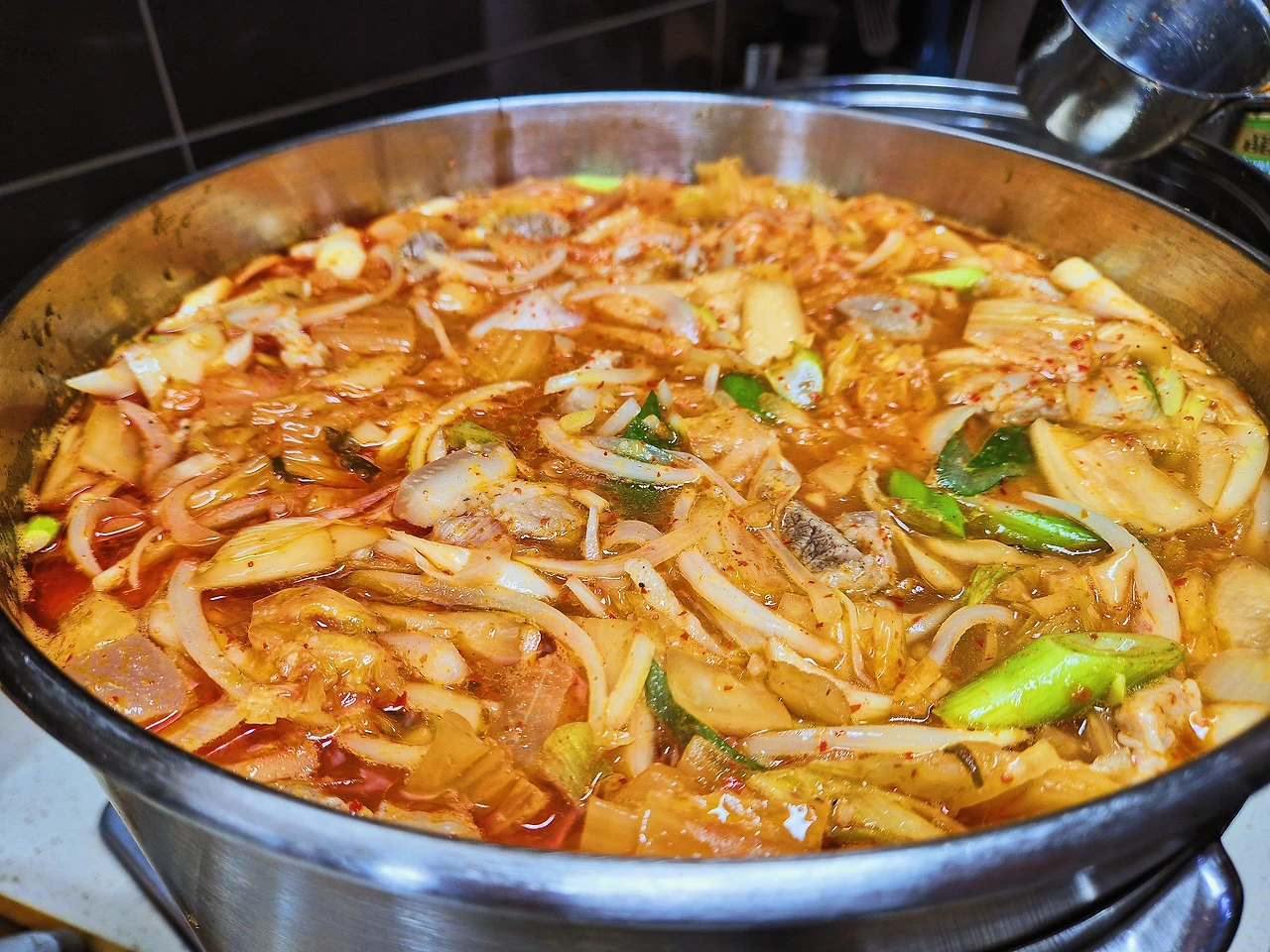 그는 무슨 일이든 마음이 정해지고 나면 척척박사인 머리, 그리고 손과 함께 일사천리로 일을 진행시킨다. 북어대가리에 붙은 아가미를 일일이 떼내어 육수를 끓임과 동시에 양파와 파, 목살을 손질해 주고 김치도 송송 썰어 준비하니 이를 어쩐다. 순식간에 30인분이 아니라 50인분은 되는 양이 완성됐다.