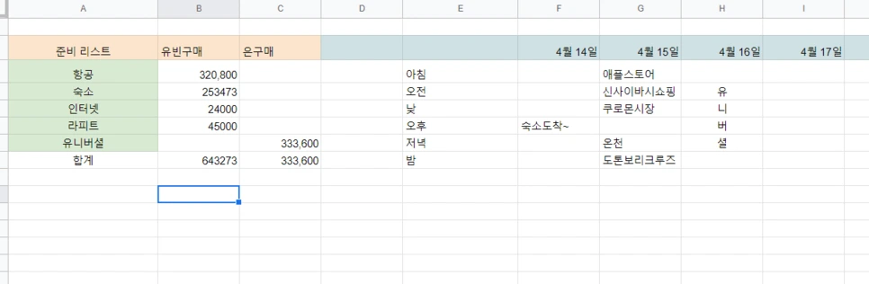 대략적인 우리의 계획이었다. 물론 예상대로 되지 않은 일이 더 많았지만, 어쨌든 이렇게 여행을 준비하고 4월 14일(일) 우리는 떠났다.
