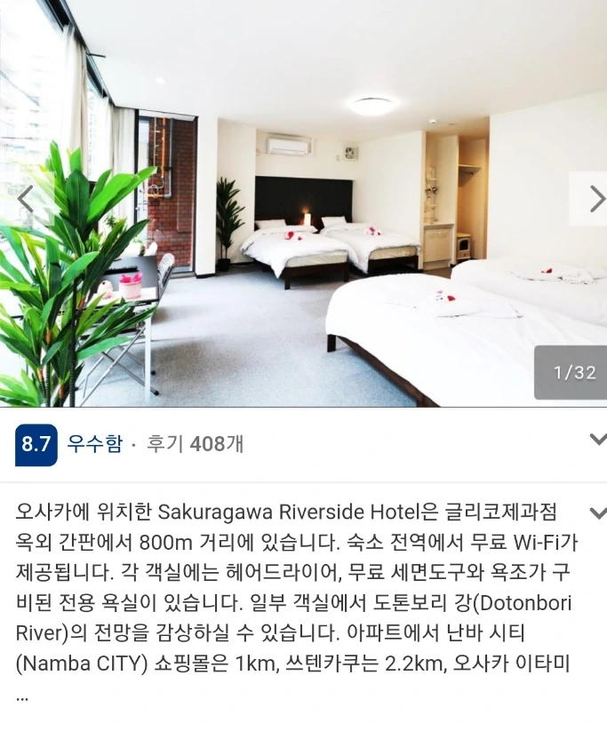 에어비앤비와 부팅 닷컴을 찾아보건 와중에 사쿠라가와 리버사이드 호텔과 그란 두세 닛폰 바시, 두 가지 호텔을 찾았다.
