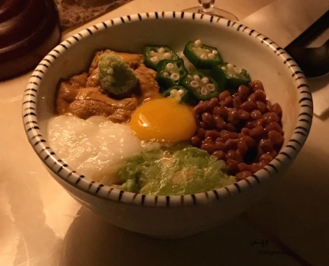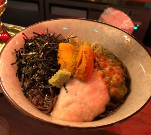 들어가면 어둡고, 심지어는 축축한 분위기에 다소 압도된다. 대표 메뉴로는 우니우동이 있는데 붓가케 우동과 같이 비벼먹는 우동이다. 우니와 낫또, 와사비를 버무려 먹는 음식으로 일본식 고추가 더해져 매콤한 맛도 있다. 우니 향이 강하지 않아 처음 접하는 사람들도 무리 없이 먹을 수 있다. 이 우동은 은근히 한라산 소주와 잘 어울린다. 이 집은 주류 종류도 굉장히 다양하다. 소주는 물론 사케, 와인 심지어는 조금 과하다 싶게 모엣샹동도 있다.