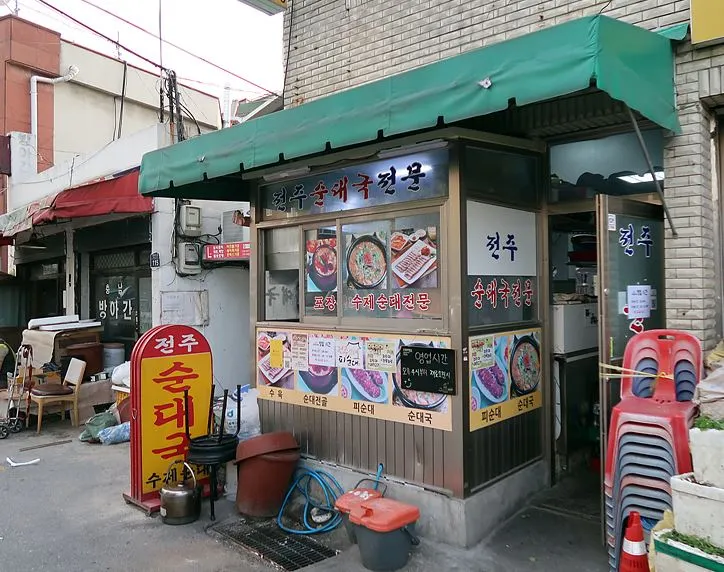 여기 피순대는 진짜 맛있다. 피순대는 당면이 들어간 일반 순대와 다르게 선지가 들어간 순대를 말한다. 고소하고 부드러워 선지를 먹지 못하는 사람도 거부감 없이 먹을 수가 있다. 전주가 유명하다는데 원조인지는 모르겠다. 어쨌든 청구에 있는 이 곳 이름도 '전주순대국'. 메뉴는 순댓국, 피순대, 순대 모둠이 끝이다.
