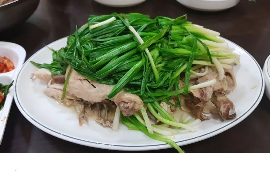 푹 고아져 야들해진 살 위에 달달한 실파가 올라져 있다. 어느 살을 집어도 퍽퍽하지 않다. 그 위에 실파를 둘러 양념장과 찍어먹으면 된다. 가게에 따라 실파 대신 부추가 올라간 집도 있다. 파의 약한 향이 닭 맛을 심심하게 만들지 않기에 개인적으로는 실파를 더 선호한다.