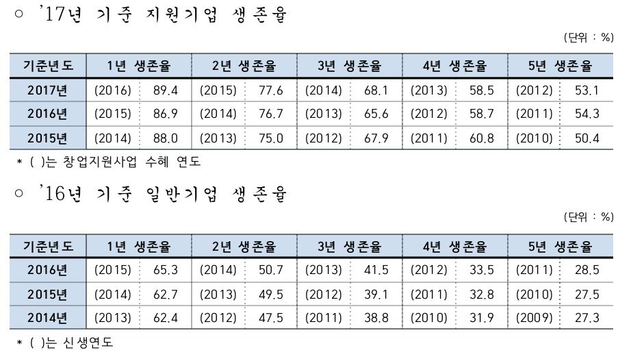 3월 발표된 “창업지원기업 이력·성과 조사”(이하 조사)에 따르면, 17년 기준 창업지원기업의 5년 생존율은 53.1%로 일반창업기업의 생존율 28.5%(통계청 기업생멸행정통계, 2016년 기준) 보다 높게 나타났다.