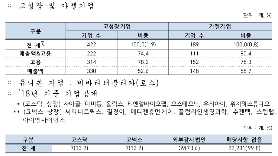 3년 연속 매출액이나 고용이 연평균 20% 이상 성장한 ‘고성장 기업’은 총 422개이며, 이 중 창업 후 5년 이내의 고성장기업인 ‘가젤기업’은 189개 나타났다.