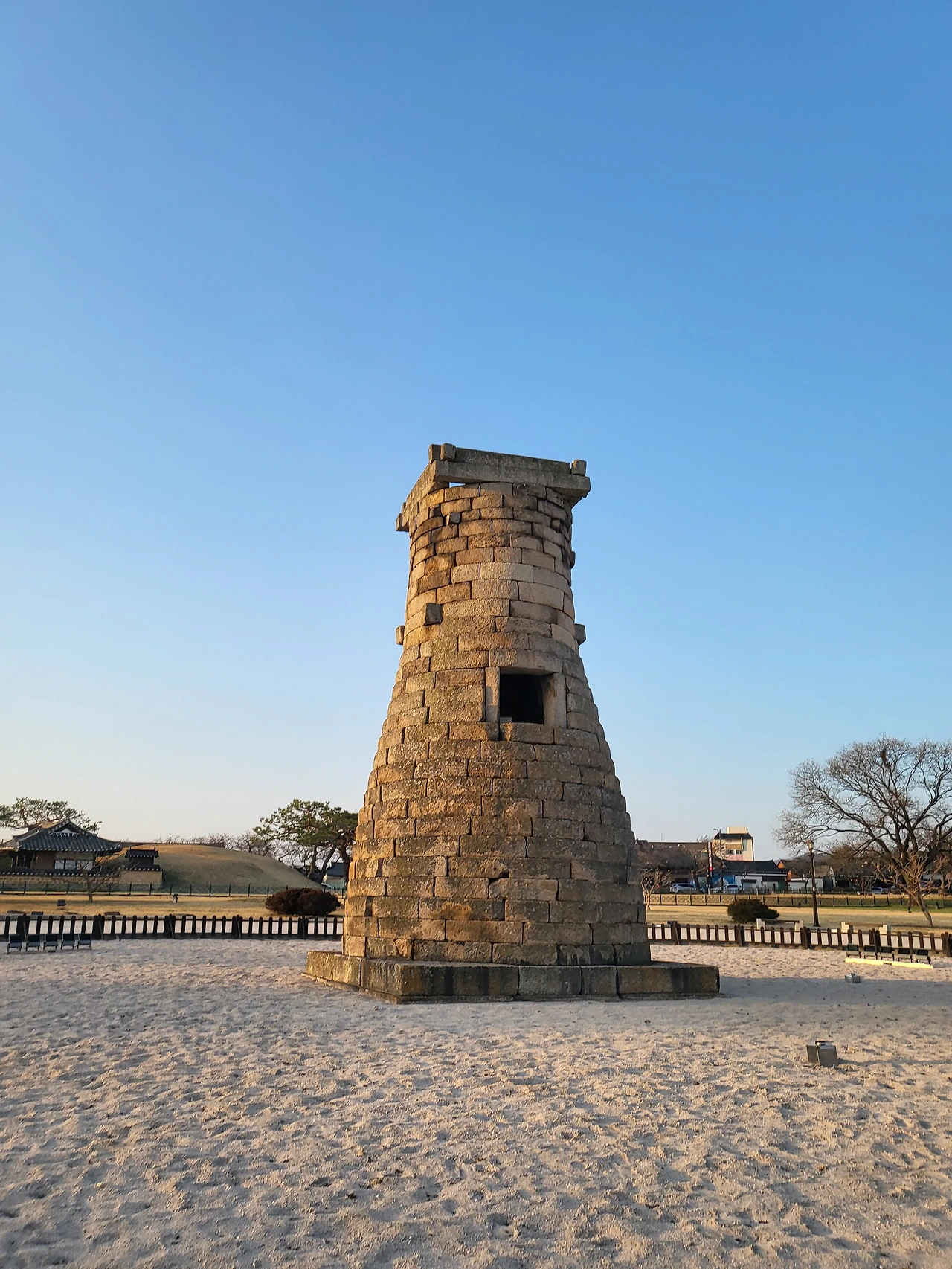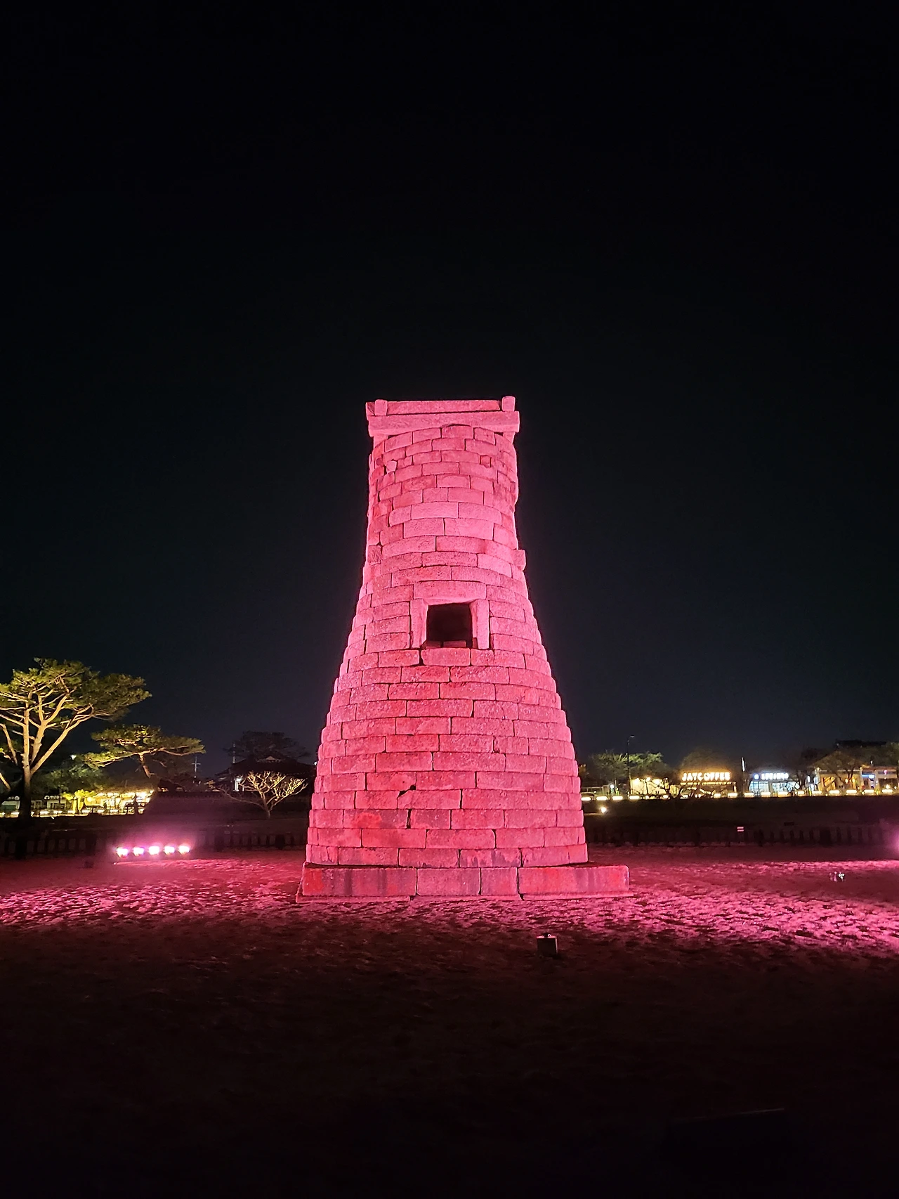 동궁과 월지에서 걸어서 10분 거리에 첨성대가 있는데 밤에 보면 느낌이 또 다르대서 가보았다. 분위기가 확실히 다르긴 한데 조명이 아주 색색깔이라 좀...광기에 찬 느낌.