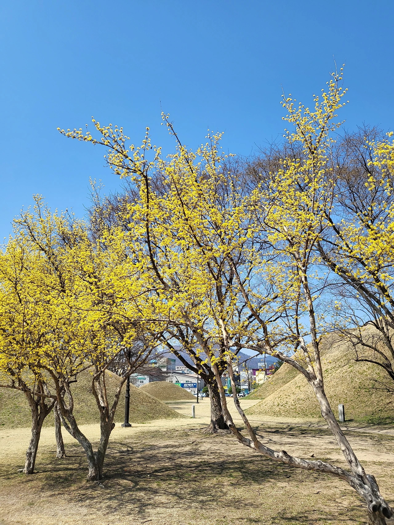 식당 옆에 고분들이 있어서 산책했는데 꽃은 피어나고 있고 하늘은 푸르고 너무 아름다운 순간이었다. 이런 순간순간의 장면을 위해 여행을 한다.