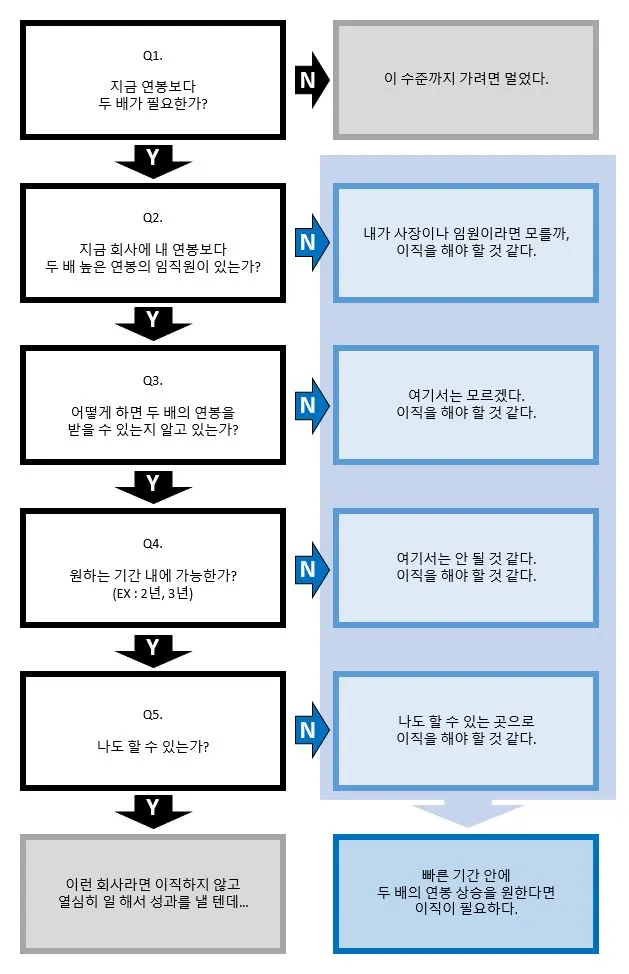 아래 그림은 제가 이직을 결정했던 당시 생각의 흐름입니다. 어려운 환경 속에서 부양해야 하는 가족이 많았고, 기존에 받던 연봉보다 두 배 정도의 수입이 없으면 정기적인 지출을 감당할 수 없는 상황에서 하게 된 생각이라 모두가 동일한 흐름으로 생각할 필요는 없지만, 이직이 필요한지 아닌지 결정하는데 참고하시기엔 도움이 될 것 같습니다.