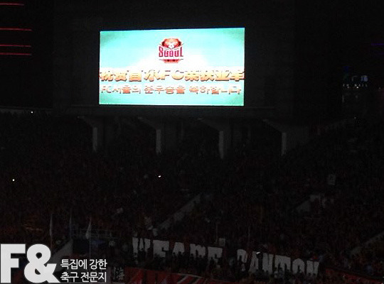 그렇게 경기 종료 휘슬이 울리고, 우리 원정단은 마법처럼 5만 8천 명의 광저우 팬들이 내뿜는 엄청난 함성에 귀가 멀어버렸다. 너무나도 비현실적인 그 순간이었기 때문에, 경기장 전광판에 그려진 FC서울의 엠블럼과 한글이 한 번에 이해되지가 않았다. 전광판에는 바로 이렇게 쓰여 있었다.