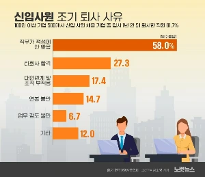 한국경총에서 100인 이상 사업장 500개를 대상으로 신입사원 퇴사 사유를 조사한 결과 가장 많이 나타난 응답이 직무가 적성에 맞지 않아서 58%이다.