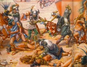 순식간에 축제의 현장은 살육의 장으로 바뀌었다 (정확하게 말하자면 살육의 대상이 반대로 바뀌었다. 가해자였던 아즈텍인들이 피해자가 된 것이다) 인신공양 희생자들을 죽이던 사제들, 근처의 구경꾼들, 아즈텍 병사들, 음악을 연주하던 자 등 그 자리에 있던 사람은 죽음을 면치 못했다. 스페인 병사들은 닥치는 대로 찌르고 베었다.