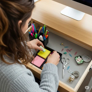 맨 위에는 사무용품들 즉, 스테이플러, 딱풀, 개인 약품, USB, 포스트잇 등 부피가 작고 언제든 쉽게 꺼내서 쓸 수 있는 물건들을 두도록 하자. 중요한 것은 그 물건은 항상 그 자리에 있어야 한다는 것이다. 다른 곳에서 업무를 했더라도 물건만큼은 꼭 제자리에 두자.