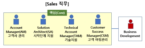 아래 표를 보면 영업팀의 업무 프로세스를 알 수 있다. 영업 전에는 사전 영업팀이 통해 고객에 대해 미리 파악하고, 재무상태에 대해 확인하게 된다. 영업 단계에서는 컨설팅팀이 기술에 대한 고객 자문을 담당하고, 연관 상품 퍈매를 위해 다른 영업팀이 현장에 동행하기도 한다. 이런 흐름을 파악했다면 이렇게 그림을 만들어 시각화하면 이해하기 참 쉽다.