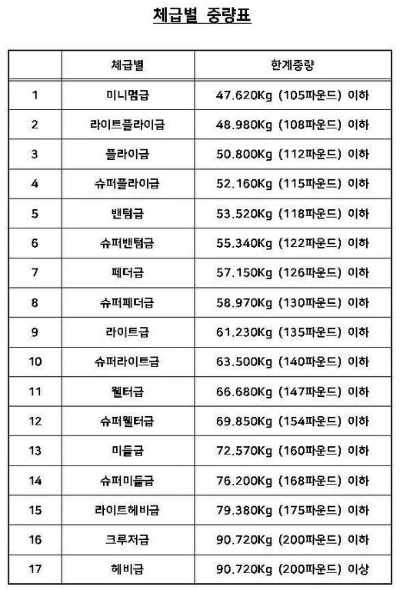 위의 표를 보면 3~4kg 단위로 촘촘하게 체급이 나뉘어 있는 것을 볼 수 있다. 그만큼 체중이 조금만 차이가 나도 상대하기 쉽지 않다는 방증이다. 그렇다면 왜 체중이 차이가 나면 상대하기 어려울까?