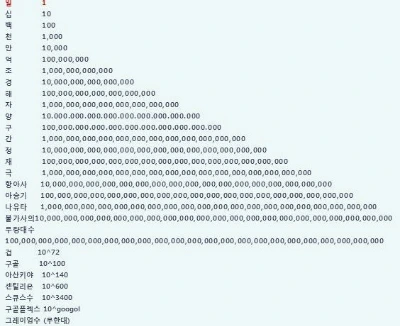 아마도 이 정도 숫자를 측정하기 위해서는 0이 어마어마하게 많이 붙은 숫자를 세는 단위가 필요할 것이다. 그렇다면 숫자를 세는 단위는 어디까지 존재할까? 우리는 보통 '일십백천만억조경해' 이 정도까지만 알고 있다. 사실 일상을 살아가는데 있어서 경 단위 이상으로 숫자를 셀 일은 거의 없다.