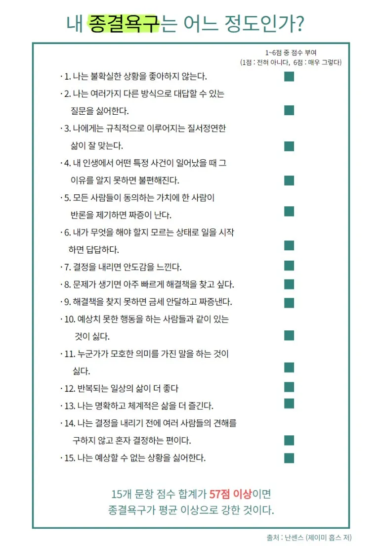 아래 진단지는 종결욕구를 다룬 또 다른 도서 난센스(Nonsense)에 있는 척도이다. 내 종결욕구는 어느 정도일까?