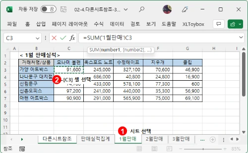 아래 사진에서 '1월 판매'가 가장 중요하다면 '1월 판매' 시트만 보이게 하고 나머지는 다 숨김으로 처리하는 것이다.