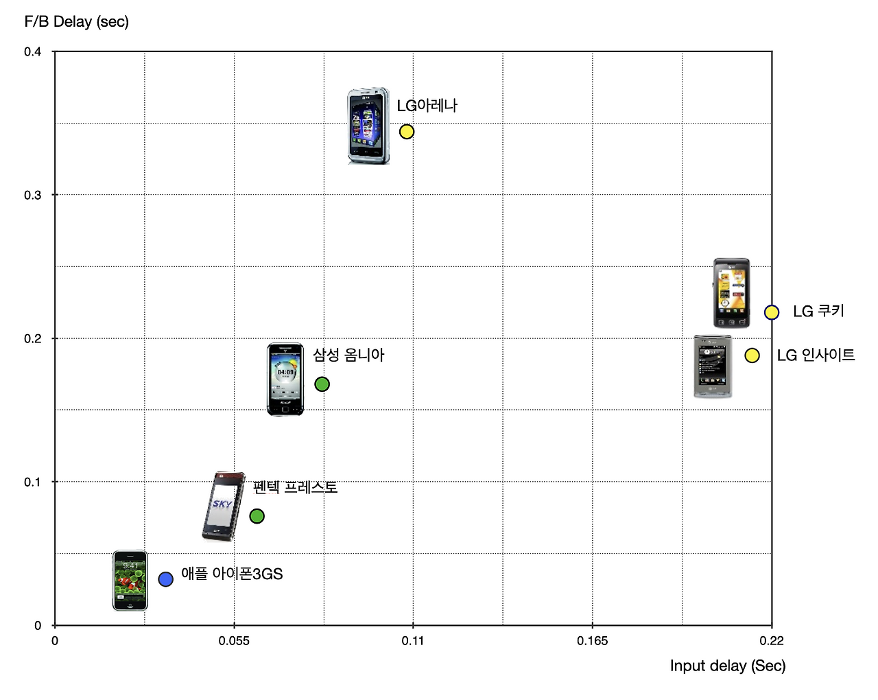 그래프를 보면 딱 봐도 아이폰이 뭔가 끝자락에 위치해있습니다. 브런치에서는 정성적인 내용을 주로 다루기 때문에 표의 자세한 의미에 대한 설명은 여기 브런치에서는 생략할게요. 간단하게 설명하면 그래프에 찍힌 점들의 X, Y값이 작으면 작을수록 GUI가 빠르게 동작하는 것입니다. 애플은 터치감 측면에서 2009년에 이미 완성형이었지요. 오죽하면 스티브 잡스가 이렇게 말했었답니다.