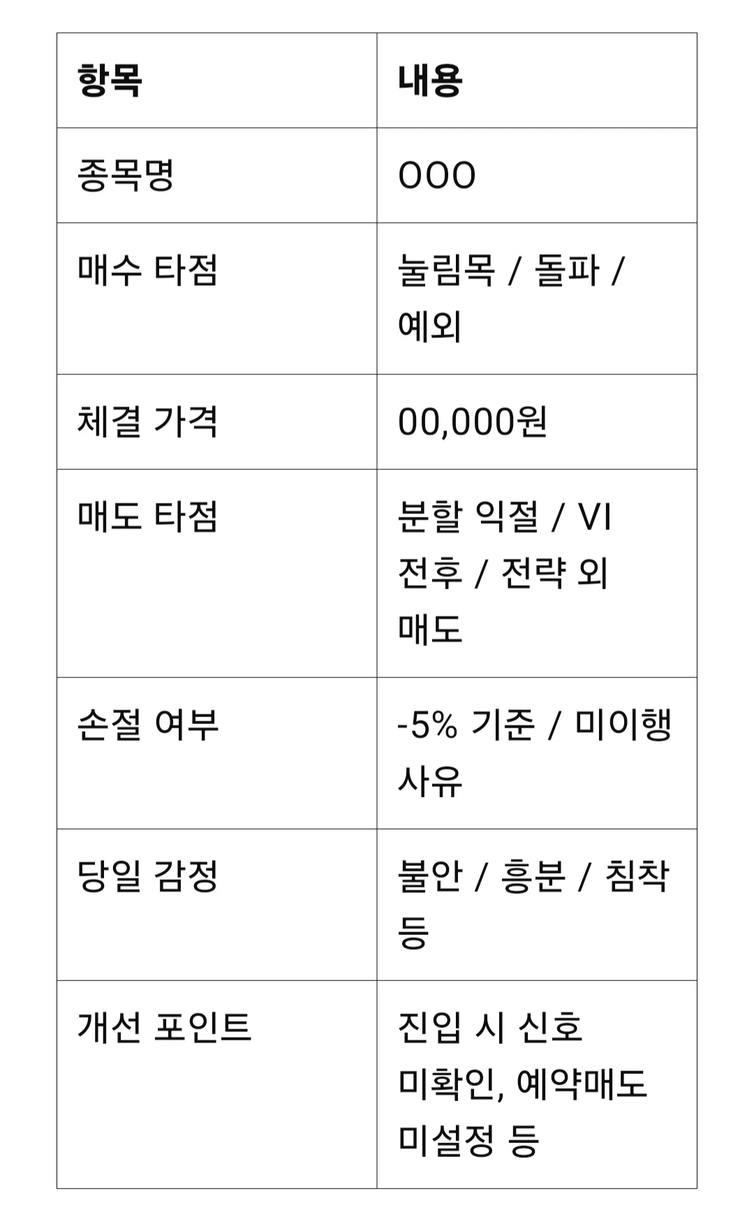 그날의 매수·매도 타이밍, 체결 가격, 거래량, 그리고 감정까지 빠짐없이 적는다면 반복되는 실수를 막을 수 있습니다.