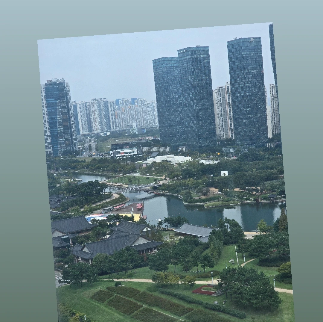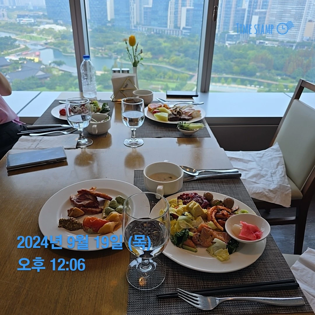 창밖에는 경원재 호텔과 정원이 보이고 센트럴 파크 호수도 보인다.