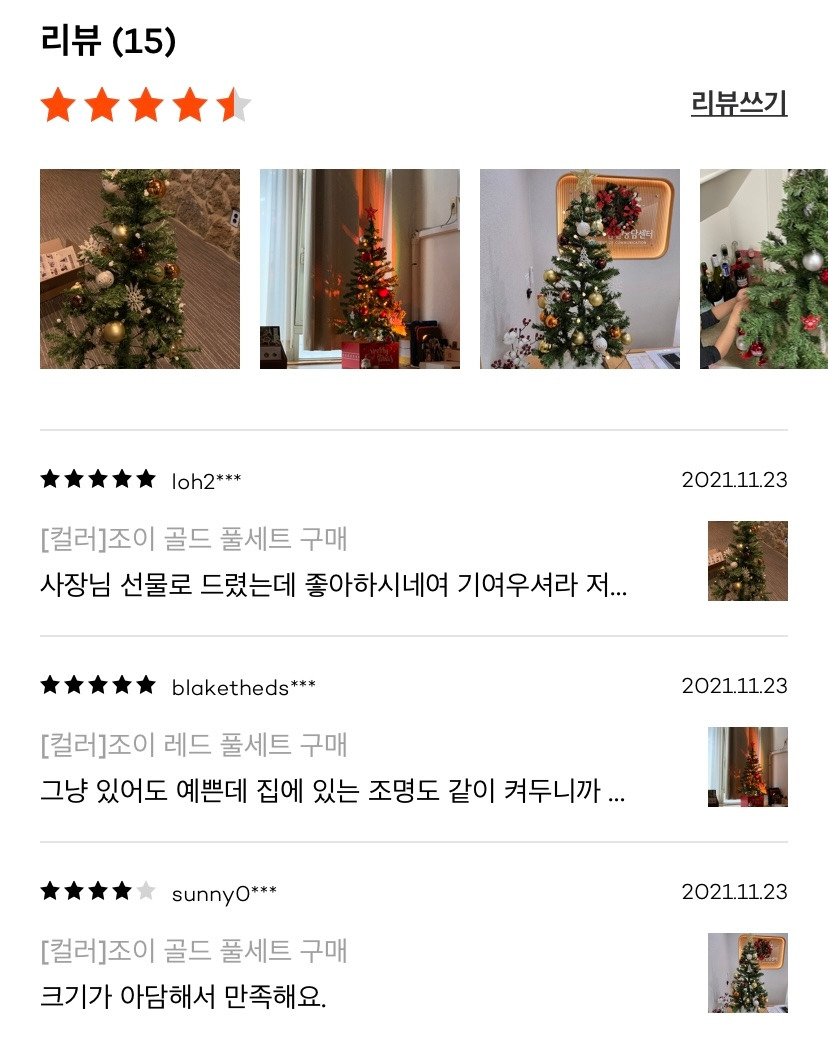 어떤 트리가 적합할지, 사이즈를 고민해보고 배치 구도를 상상해보는 동안 시간은 계속 흐르고 있었다. 이러다가 12월 25일 후에 트리가 도착하는 거 아닌가 하는 마음이 들기도 했다. 그러다 29CM에서 [스페셜 오더]로 트리 풀 세트를 아주 합리적인(!) 가격에 판매하고 있는 것을 발견했고, 다른 사람들의 후기 글을 기다렸다가 살펴보니 더 마음에 들기 시작했다. 생각보다 그렇게 큰 공간을 차지하는 것 같지도 않았고 오너먼트도 하나씩 직접 골라야 하는 것이 아니라 꾸밀 수 있는 적당량을 함께 보내주는 상품이었다. 트리 초보자에게 딱 좋은 선택지였다. 그리고 예쁜 후기 사진을 보면서 깨달았다. "예쁘면" 이미 "쓸모가 있다"는 사실을. 예쁜 쓰레기는 존재할 수 없는 것이었다.