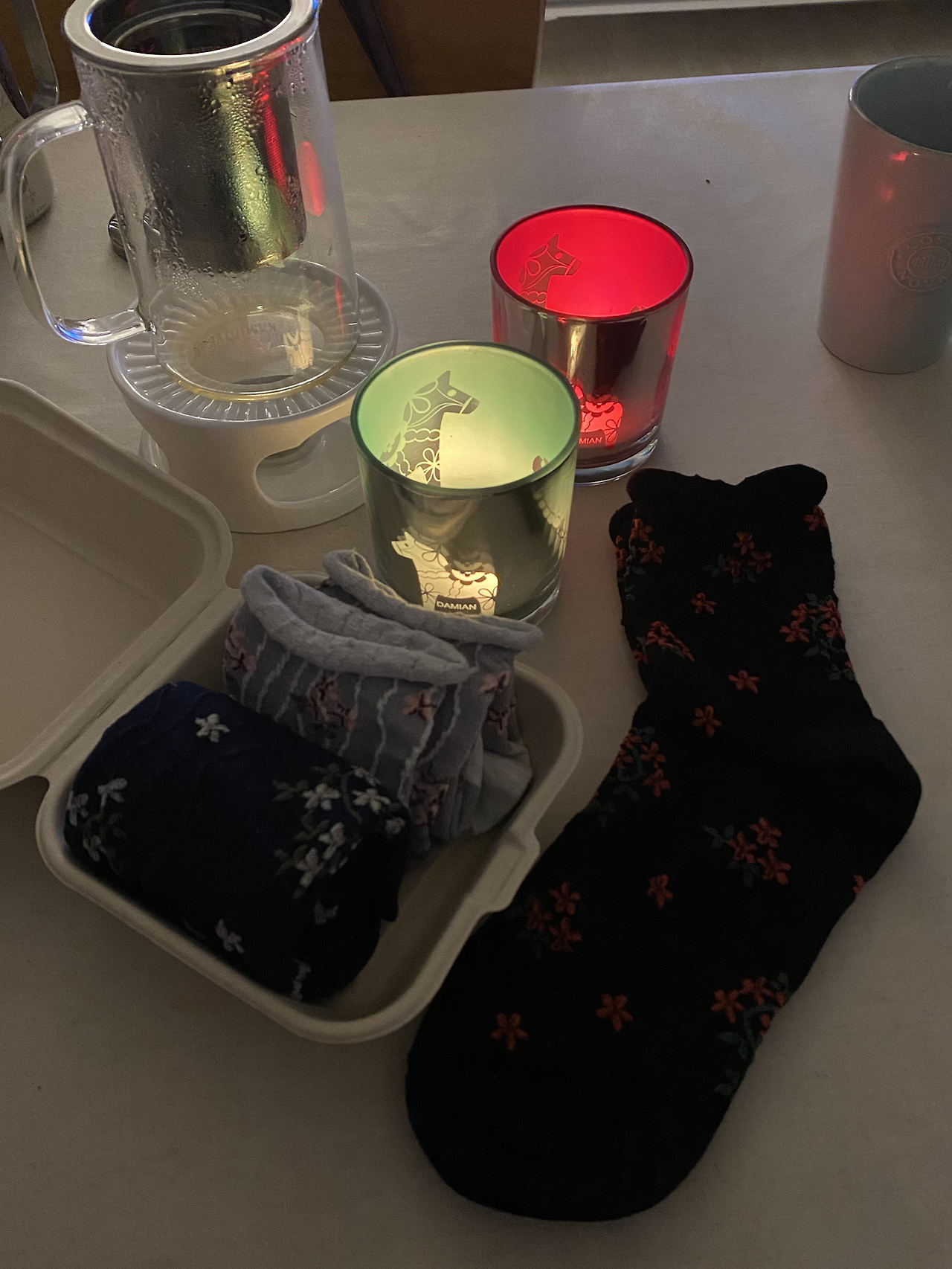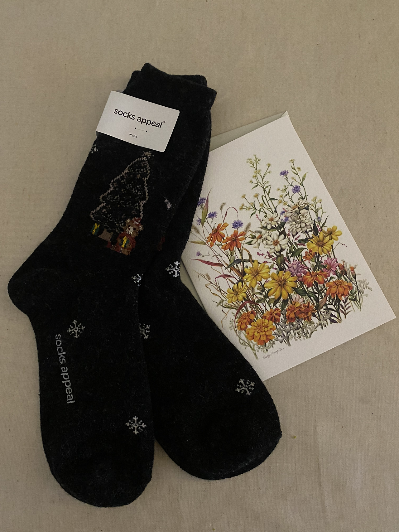 다양한 연말 모임을 가지며 의도한, 그리고 의도치 않은 선물 교환식도 많았다. 카드를 쓰면서 뭐라도 함께 주고 싶은 마음에 선물을 준비하면 그런 정성이 통했는지 친구도 가방에서 선물을 주섬주섬 꺼내곤 했다. (정말 못 말려.) 올해는 유독 양말 선물이 많았는데 양말 패션에 도전해보고 싶은 나에게 꼭 맞는 선물이라 너무 마음에 들었다. 검은색 캐시미어 양말에 크리스마스트리가 새겨진 양말은 그중에서도 나의 최애 양말이 되었는데 올블랙 운동화랑도 진짜 잘 어울린다.