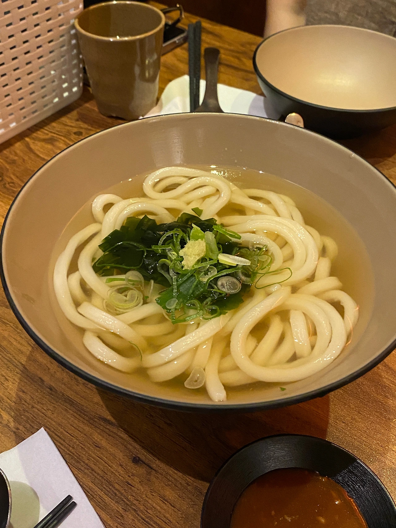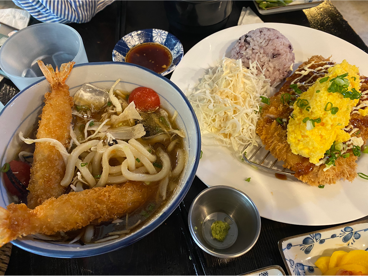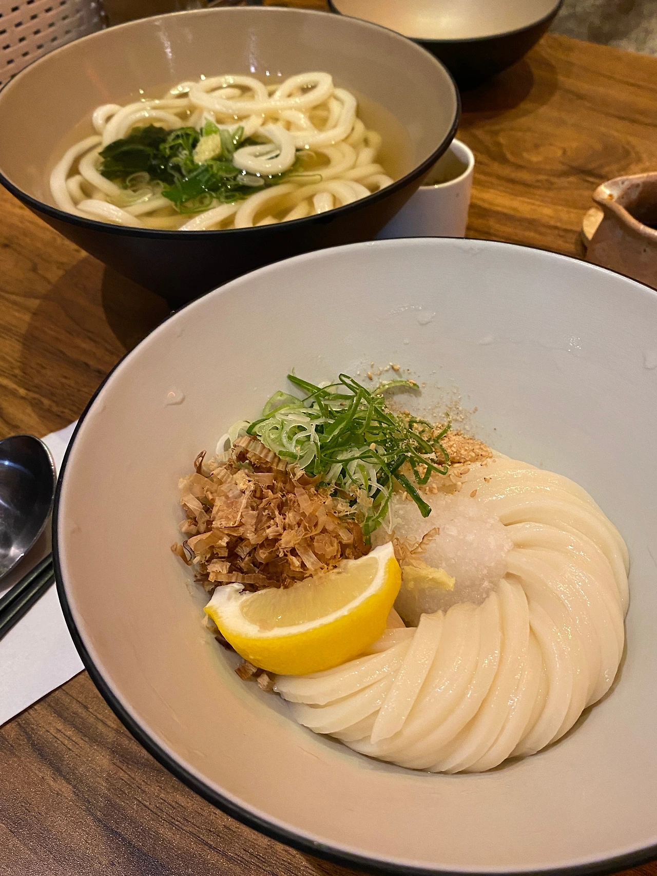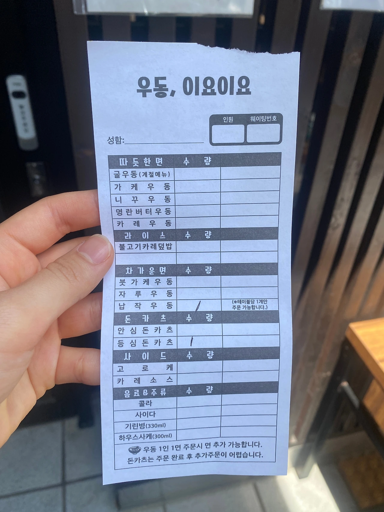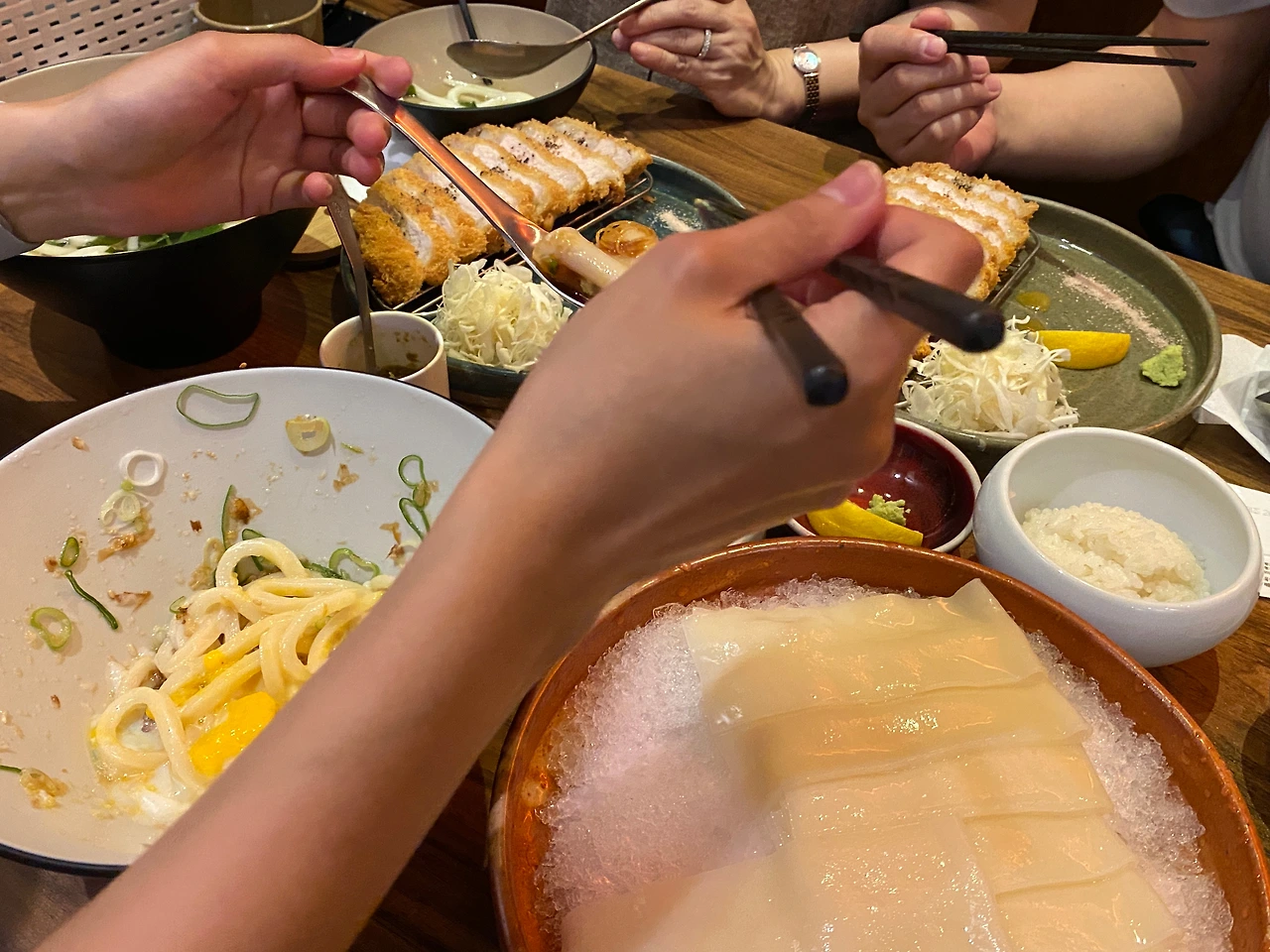 여기서도 ‘탄단지’의 (탄수화물, 단백질, 지방) 조합이 중요하다는 이유로… 등심 돈카츠 두 개와 면 요리 세 종류를 주문했다. 안심도 맛보고 싶었지만 오후 열두 시 반에 이미 재료 소진이었다. 우리는 그렇게 따뜻한 가케우동과 붓가케 우동, 그리고 ‘테이블 당 1개만 주문 가능한’ 대표 메뉴인 납작 우동은 주문했다.