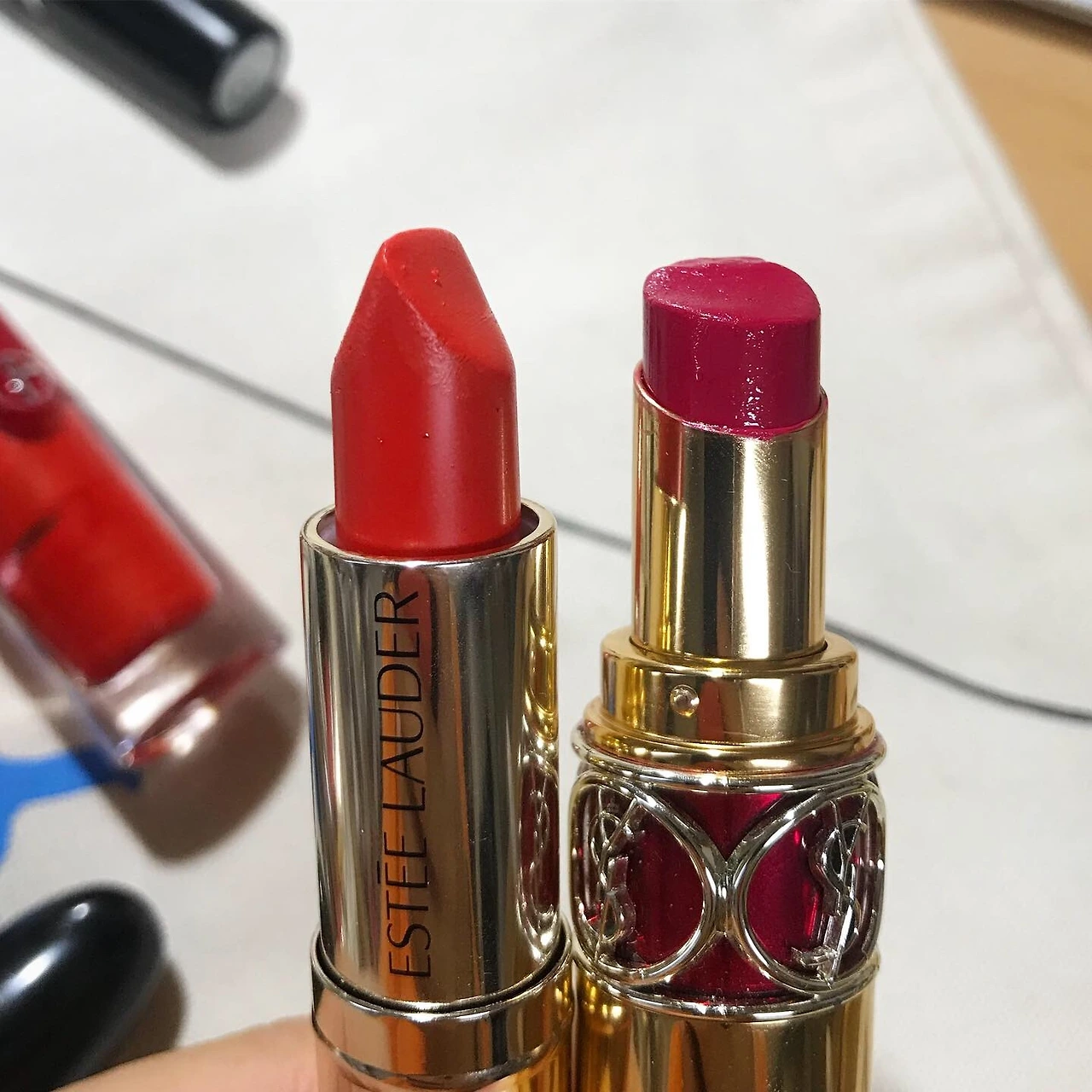 ‘웜톤’에 찰떡인 주황빛 립스틱과 그 반대인 네온빛 분홍 립스틱 (왼쪽) 그리고 F/W시즌만 되면 사게되는 버건디 레드 립스틱 (오른쪽)