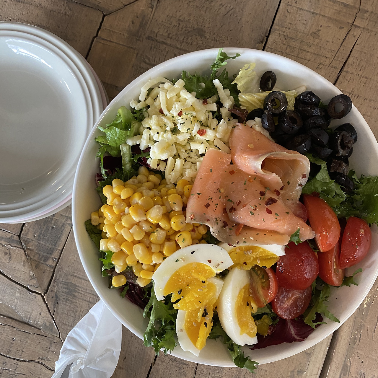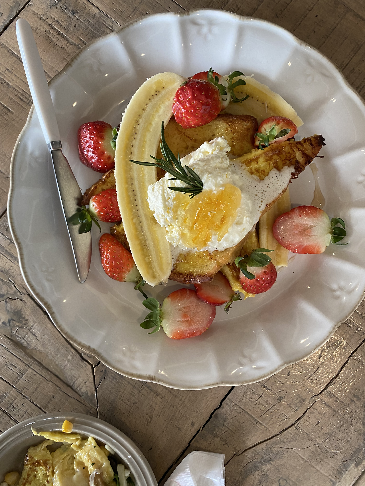 그렇다면 필자는 왜 가성비가 아쉬운 브런치 메뉴에 열광하고 언제나(?) 지갑을 열 준비가 되어있는가? 여기에는 다양한 이유가 있다. 먼저 이전 글에서도 자주 언급한 바 있듯이 필자는 균형 잡힌 영양소를 굉장히 중요시 여기는데 브런치 메뉴는 생각보다 우리 몸에 필요한 영양소를 균형 있게(?) 모두 갖고 있다. 물론 버터가 많이 들어가 지방이 많고, 계란이 주재료이기 때문에 콜레스테롤 함량이 높을 것이고, 설탕이 많이 들어가 탄수화물과 당류가 필요 이상일 것이라고 주의를 주는 누군가가 있을 수 있지만 이번만큼은 모르고 넘어가고 싶으니 양해 부탁드리는 바다. (머쓱) 그래도 비타민과 식이섬유 가득한 콥 샐러드로 시작해서 단백질을 넉넉하게 충전해줄 치즈 버섯 오믈렛으로 중간을 짭조름하게 장식해주고, 마지막으로 단짠의 굴레에서 벗어날 수 없는 우리에게 달달한 바닐라 아이스크림과 제철과일이 곁들여진 프렌치토스트로 입가심을 한다면 '스타터' '메인' '디저트, ' 즉 코스 요리 부럽지 않은 한 끼 식사가 완성된다. 완벽해...