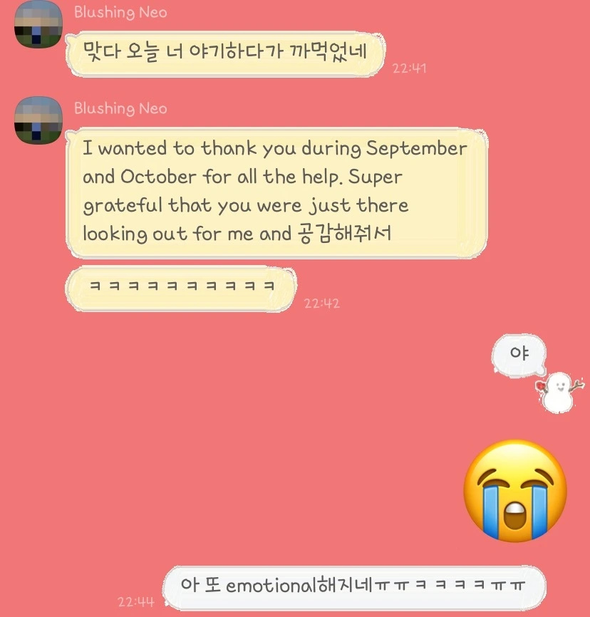 하지만 해당 글을 게재하고 벌써 약 삼 년이라는 시간이 지났다. 대학원에 갓 입학하여 아직 학부생 친구들이 주변에 많았고 "사회생활"은 아직 나와는 거리가 먼 개념이자 사회 활동이라고 생각하던 시절이었다. 벌써 박사 2년 차를 맞이한 대학원생으로서 '자연스럽게' '친구를 사귀는' 일은 거의 없어지고 말았다. (아주 없어졌다고 말해도 과언이 아니지만 일말의 가능성을 위해 "거의"라고 표현하고 싶다.) 기업 생활보다 압박감이야 덜 하겠지만 준 (semi) 사회생활에 버금가는 프로페셔널함을 요구하는 대학원 생활을 하다 보니 새로운 친구를 사귀는 일에 쏟을 에너지를 많이 잃은 것 같다. 지금보다 더 어렸을 때 많은 선배들이 앞으로 나이가 들수록 인간관계는 좁아질 일만 남았다고 했었는데 살짝 이른 감이(?) 있지만 벌써 몸소 체험하는 중이다. 요즘엔 새로운 인연을 만들기 위한 노력도, 따로 1:1 만남을 요청할 용기도 잘 생기지 않아 혼자 머쓱함을 삼키는 일이 더 많아지고 있다.