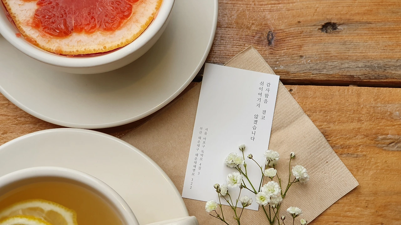알게 된 이후로 험한 날씨와 귀찮음을 이겨내며 들르는 카페가 생겼다. 매일 안개꽃 생화 조금과 함께 글귀명함이 커피와 음식에 곁들여 나오는 정성 때문이다.