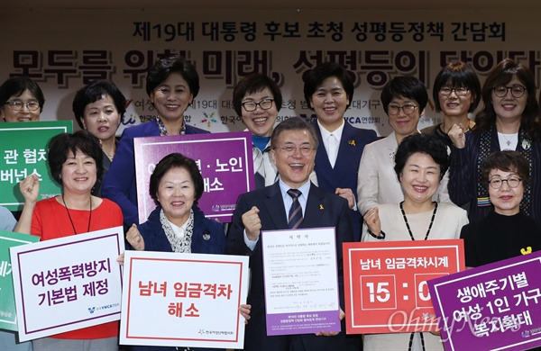 ▲ 문재인 대통령이 후보 시절이었던 지난 4월 21일, 서울 용산구 한국여성단체협의회 강당에서 열린 '모두를 위한 미래, 성평등이 답이다' 대통령 후보 초청 성평등정책 간담회에서 성평등 정책 시행을 약속한 후 이 자리에 참석한 관계자들과 기념촬영하고 있다. ⓒ 남소연