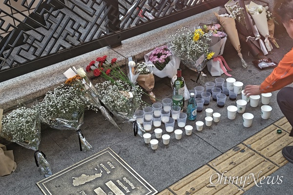 ▲ 시민들의 추모 이태원 압사 참사가 발생한 이태원역 1번 출구 인근에 시민들이 꽃과 술잔을 올리며 희생자들을 추모하고 있다. ⓒ 곽우신