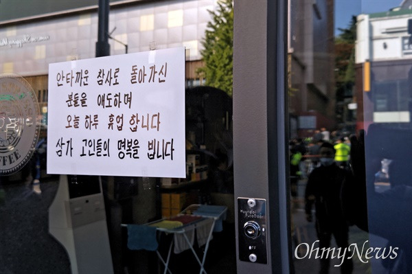 ▲ 휴업에 들어간 가게 30일 오전, 압사 참사가 난 이태원 골목길 현장 인근의 한 카페가 휴업을 공지하고 있다. ⓒ 곽우신
