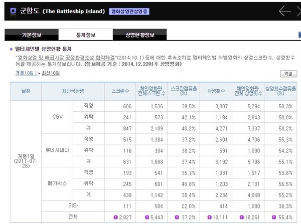 교차상영(퐁당퐁당)을 포함한 스크린 수를 포함하면 37.2%로 떨어지지만, 이건 눈 가리고 아웅 수준이다. 또 좌석 점유율은 52.8%로 높은 편이었으나, 동시에 <군함도>를 상영한 전체 좌석의 절반은 비었던 셈이다. 요약하자면, <군함도>는 기네스북에 오를 만한 상영 횟수와 상영 점유율을 토대로 개봉 첫날 100만에 육박하는 관객을 끌어 모은 것이다. 이 수치가 실감나지 않는다면, 대형 멀티플렉스의 상영시간표를 직접 확인해 보시라.